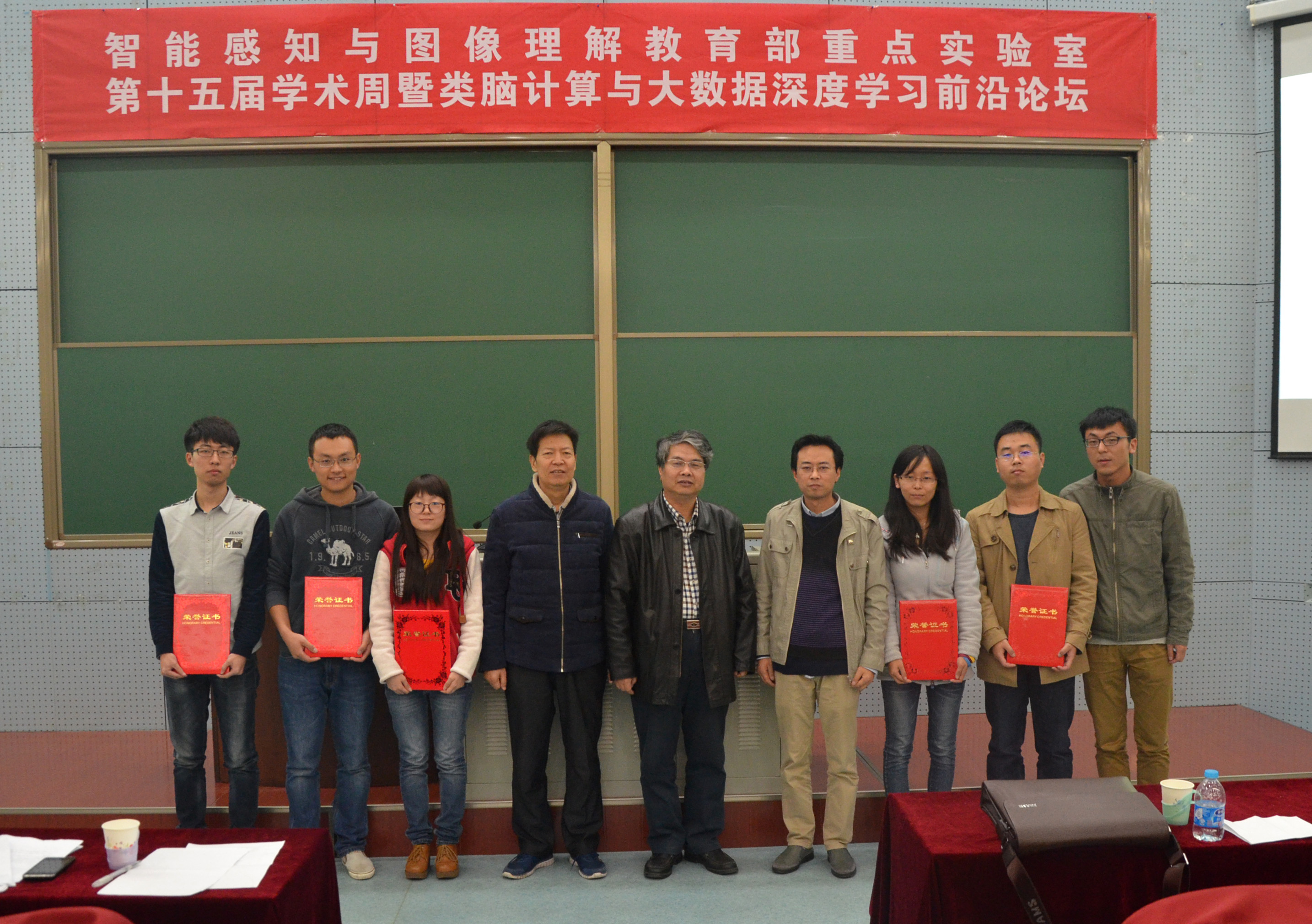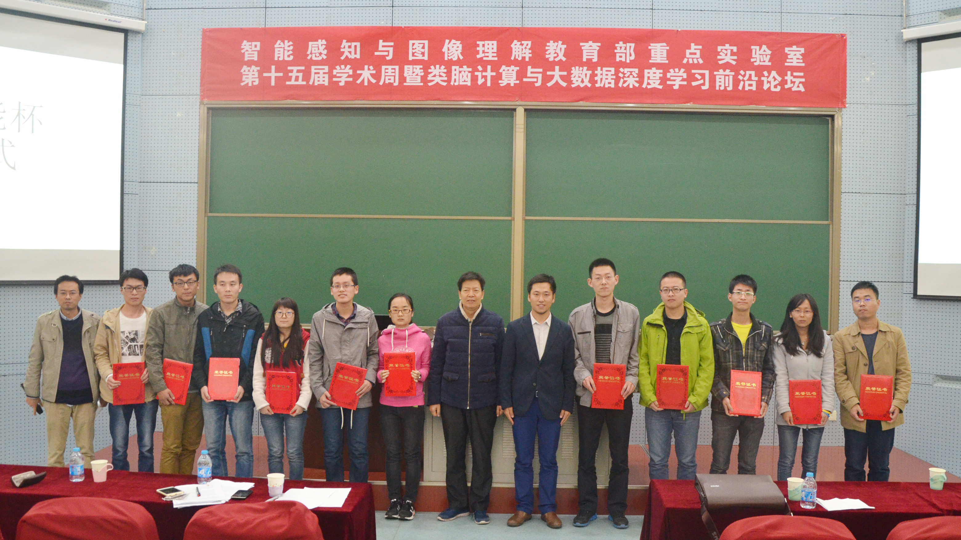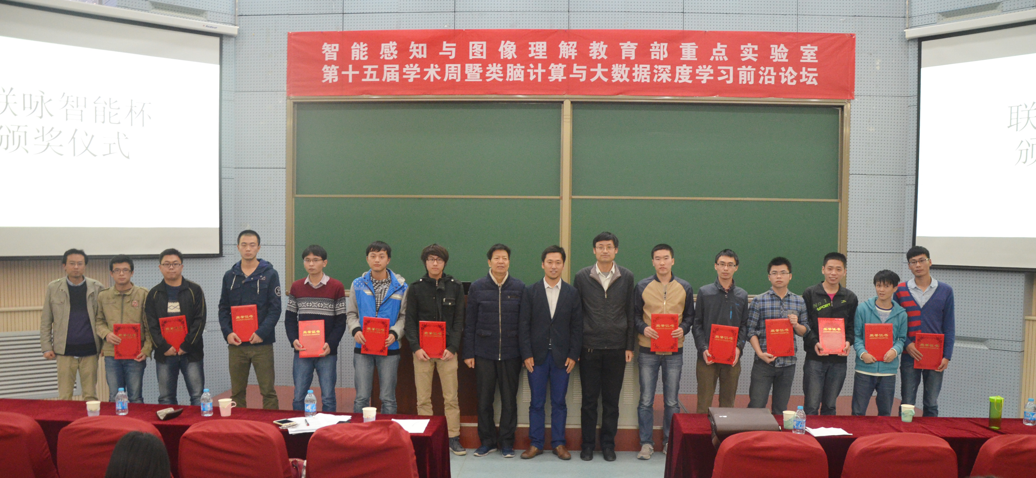 闭幕式上国际智能感知与计算研究中心主任兼智能感知与图像理解教育部重点实验室主任焦李成教授和电子工程学院党委书记徐克发表了热情洋溢的讲话,同时对师生们提出了殷切的期望。联咏电子科技(西安)有限公司代表梁建华经理同电子工程学院党委书记徐克为2015联咏杯程序竞赛获奖学生颁发奖状;最后,智能感知与图像理解教育部重点实验室主任焦李成教授同电子工程学院党委书记徐克做出贡献的博士研究生、硕士研究生颁发了“突出贡献奖”的荣誉证书。