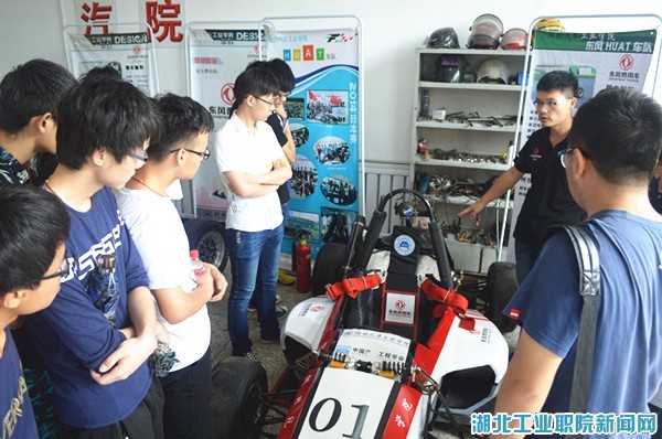 紧接着大家参观了湖北汽车工业学院东风HUAT车队工作室,车队的学长热情地为高职本科“3+2”的同学们介绍了HUAT车队的基本情况。同学们来到车队的赛车展示区,观看车队的历届参赛赛车,在学长介绍下,同学们边听边提问,详细了解赛车的装配过程、车架设计加工、发动机的选型和基本参数等情况,为HUAT车队所取得的成绩和荣誉赞赏有加。