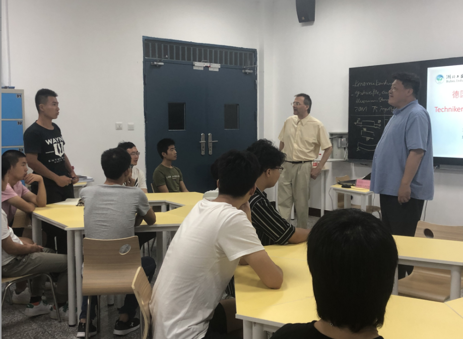 会上伟德国际1949官网副院长薛嘉鑫对戈德霍弗博士做了简短的介绍,谈了此次讲座的目的和意义:强化同学们的学习意识,珍惜中德技术员班学习的机会,并为未来的中德合作项目打下良好基础。格哈德·戈德霍弗博士就三个方面进行了深入讲解。首先介绍的是他个人的职业经历以及在因戈施塔特技术员学校的教学经历,并阐述了自己把在奥迪技术中心的工作经验与教学相结合的实例。学生们对此产生浓厚兴趣,纷纷提出了自己感兴趣的问题,格哈德·戈德霍弗博士也一一对其详细的解答,讲座中交流的气氛十分浓厚。