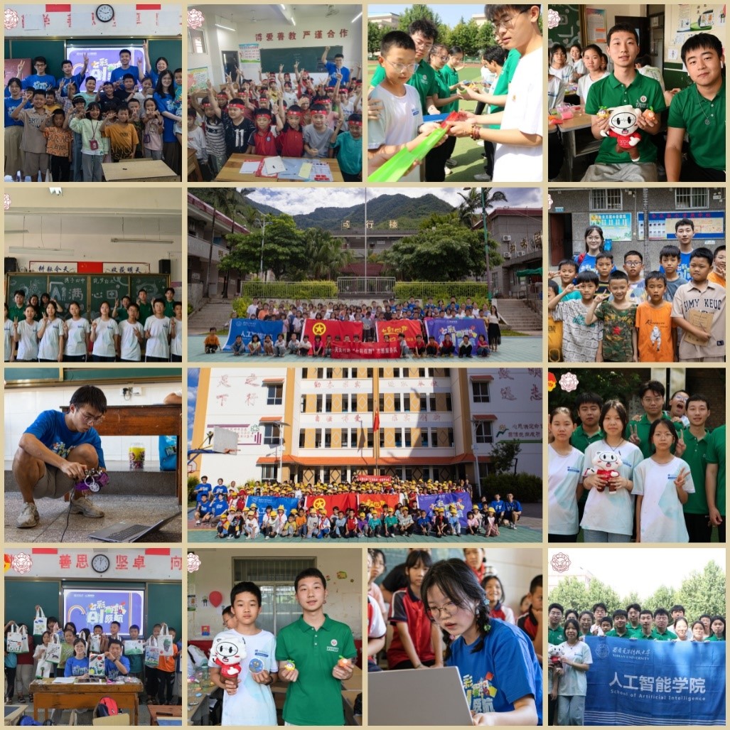 两支团队分别以“知识赋能未来”“爱心支教,科技启蒙”为主线,围绕思想引领、文明生活、身心成长、科技创新、快乐学习、艺术素养、文化传承等内容,以前沿的AI技术、多样的课程形式、轻松的授课风格、专业的课程设计,为乡村学子们带来了一段科技、思想、文化与趣味兼顾的难忘假期。站在乡村支教的讲台上,通过“签名征集”“大学生主题生活分享会”“签名蹲”等破冰活动,实践队员和中小学生们迅速融入在一起,两支实践队伍还充分发挥人工智能特色,基于专业知识引入了AI启蒙、智能小车巡线编程大赛、人工智能基础知识、AI绘图等特色课程,真正为孩子们构建德、智、体、美、劳“五育并举”的智慧课堂,为孩子们的快乐学习和全面发展保驾护航。