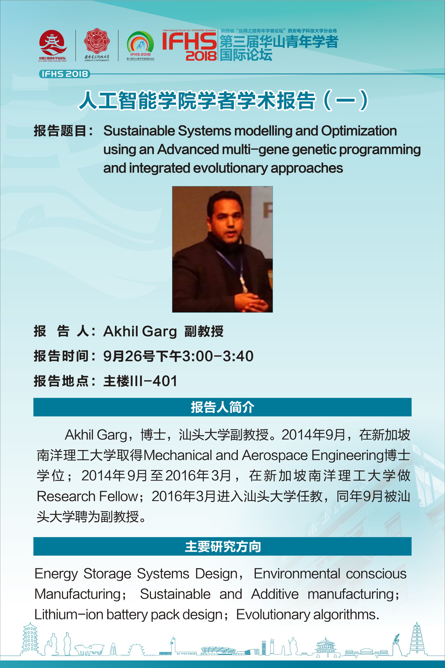 9月26日下午,Akhil Garg副教授、岳广辉 博士、薛尧博士、杨韬博士、庄丽娜博士5人将来我院参加“华山青年学者国际论坛”437437必赢国际网址分论坛相关活动。届时,5名青年学者将在我院做学术报告。学术报告具体信息如下: