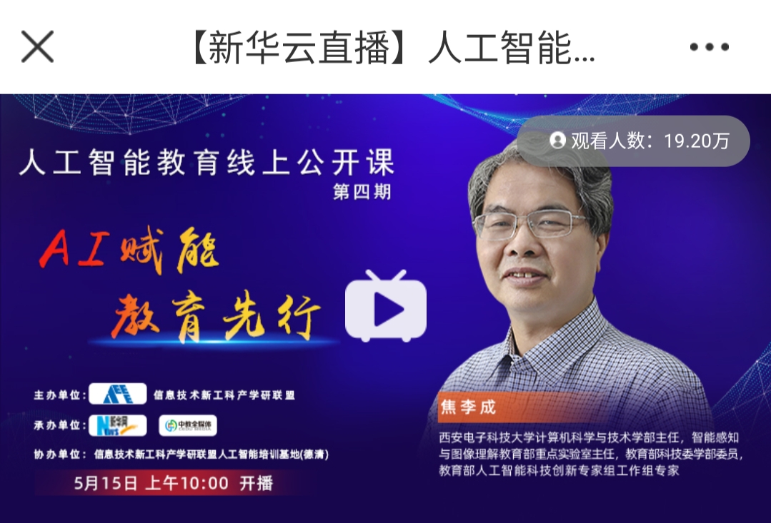 2020年5月15日,由信息技术新工科产学研联盟主办,华网、中教全媒体承办,信息技术新工科产学研联盟人工智能培训基地(德清)协办的“人工智能教育线上公开课”第四期,在新华网客户端云直播及中教全媒体直播平台同步播出。计算机科学与技术学部主任、437437必赢国际网址焦李成教授做了题为“人工智能人才培养的挑战与思考”的精彩报告。