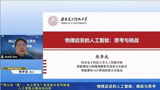 2022年1月1日,欧洲科学院外籍院士、俄罗斯自然科学院外籍院士、IEEE/IET/CAAI/CCF/CIE/CAA Fellow、437437必赢国际网址计算机科学与技术学部主任、人工智能研究院院长、华山学者杰出教授焦李成受邀参加新年第一课——“同心战疫云上学术”信息技术系列讲座,并做了题为“物理气启发的人工智能:挑战与思考”的报告。
