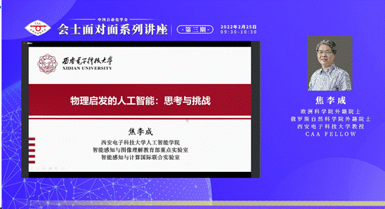 2022年2月25日上午,欧洲科学院外籍院士、俄罗斯自然科学院外籍院士、IEEE/IET/CAAI/CCF/CIE/CAA Fellow、437437必赢国际网址计算机科学与技术学部主任、人工智能研究院院长、华山学者杰出教授焦李成受邀参加由中国自动化学会为学会会士量身打造的高端学术交流平台——CAA会士面对面系列活动第三期,做了题为“物理启发的人工智能:挑战与思考”的报告。