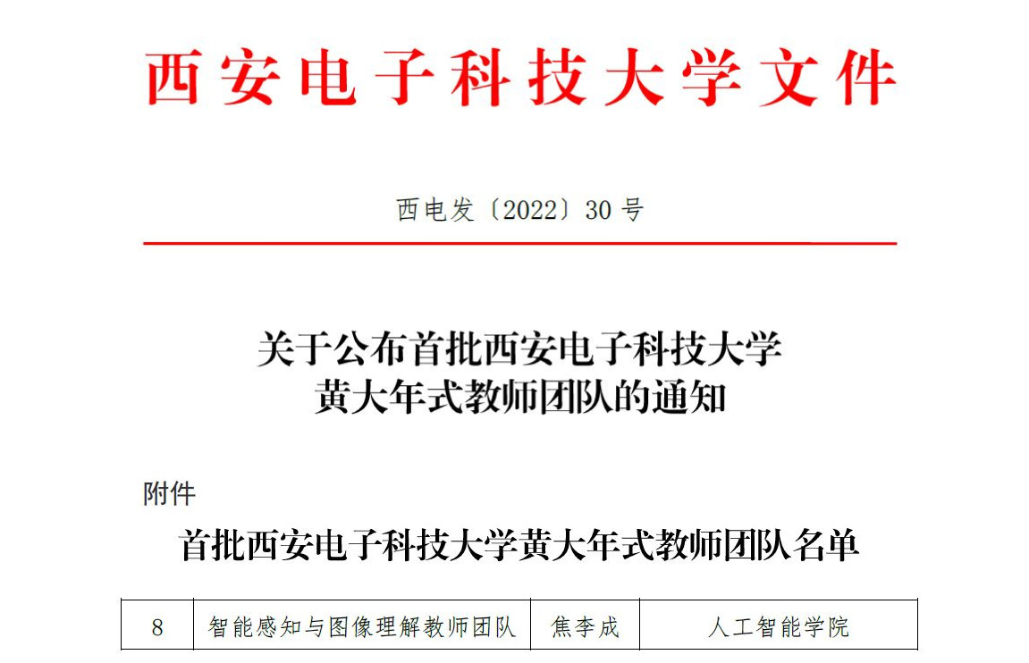近日,学校印发《关于公布首批437437必赢国际网址黄大年式教师团队的通知》(西电发〔2022〕30号),认定全校8个教师团队为首批437437必赢国际网址黄大年式教师团队,437437必赢国际网址焦李成院士带领的“智能感知与图像理解教师团队”入选。