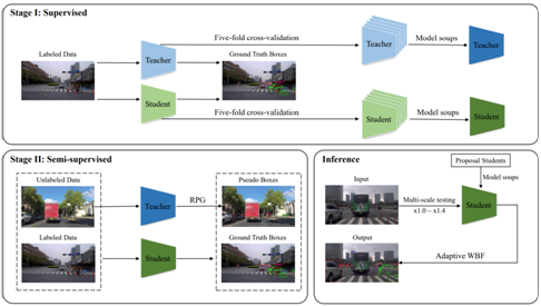 亚军方案:队伍提出一种两阶段自训练教师-学生框架,使用一个两阶段检测器作为教师模型为单阶段检测器的学生模型提供多样性的伪监督信号。在第一阶段,通过集成学习与模型融合Model Soups构建了鲁棒的教师、学生模型。在第二阶段,教师模型通过可靠的伪标签生成策略为学生模型提供高质量的伪监督信号。在推理阶段,队伍设计一种有效的后处理流程,由多尺度测试、Model Soups以及自适应加权框融合构成。队伍突破了基于自训练的半监督学习范式的关键技术,实现了自动驾驶技术中道路目标对象检测精度的显著提升。