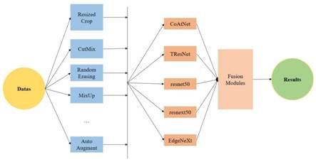 季军方案:队伍提出的方案突破了平衡模型感知差异的关键技术,实现了泛化力较强的准确率高的图像识别效果。队伍使用了CoAtNet、TResNet、RestNet50、ResNext50、EdgeNeXt五个主干网络作为基准。考虑到ImageNet 2012中的标签作为硬标签,虽然更容易获取,但却丢失了类内、类间的关联,并且对噪声数据敏感。队伍在基础模型训练过程中融合多种数据增强方法。
