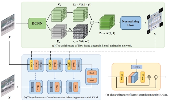 论文概述:针对图像拍摄过程中的图像模糊问题,该论文提出了一种基于隐空间先验非均匀模糊核估计的图像盲去模糊方法,利用标准化流模型将复杂的运动模糊核空间映射为简单的高斯分布空间,采用在图像隐空间内估计模糊核的方法,充分利用运动模糊核的先验信息,从而大幅提高模糊核估计准确性,并将估计出的模糊核用于提高图像去模糊的效果,继而恢复出更高的视觉质量,适用于需要产生清晰图像的场景。