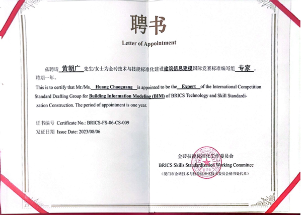 新闻网讯(通讯员 孙旭杰 阚正武)8月6日,伟德官网黄朝广教授应金砖技能标准化工作委员会的邀请,参加了在厦门召开的金砖技能国际团体标准制订之建筑信息建模竞赛标准制订工作的首次会议,并被聘为金砖技术与技能标准化建设建筑信息建模国际竞赛标准编写组专家。