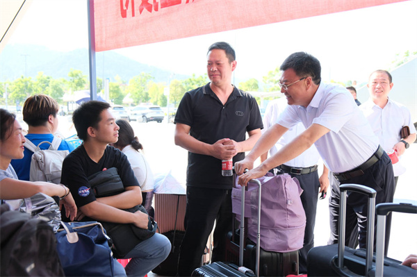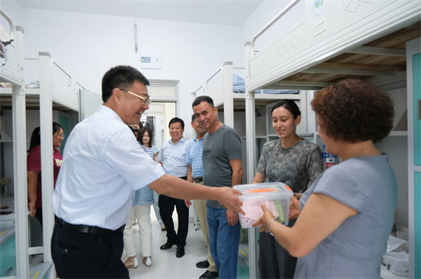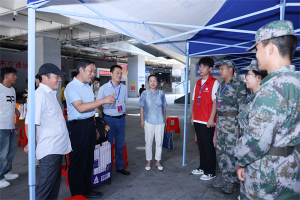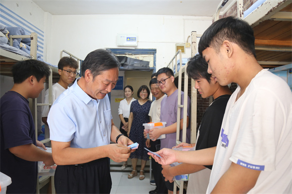 为了做好新生报到工作,学校安排大巴车、志愿者在高铁站、飞机场、客运站等主要交通枢纽迎接新生到校。“老家在哪里?”“来十堰感觉如何?”9月4日、5日,校党委书记魏文芳、校长边疆率班子成员肖海华、毛义忠、郑强、胡昌龙、李辉分别前往体育馆迎新现场、十堰高铁站、十堰火车站和学生宿舍,检查指导各项工作,看望慰问新生,并为迎新志愿者送上饮用水等慰问品。