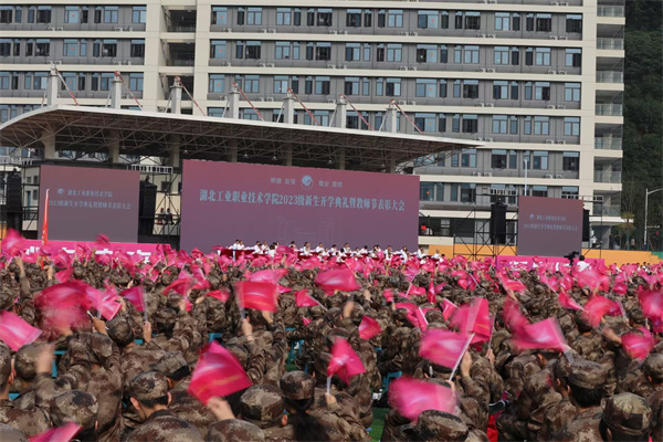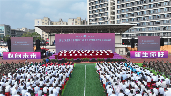 在随后的新生入校宣誓环节,全体在场老师和同学在开学典礼这一庄严的时刻,共同见证2023级湖北工业职院新生的青春誓言。