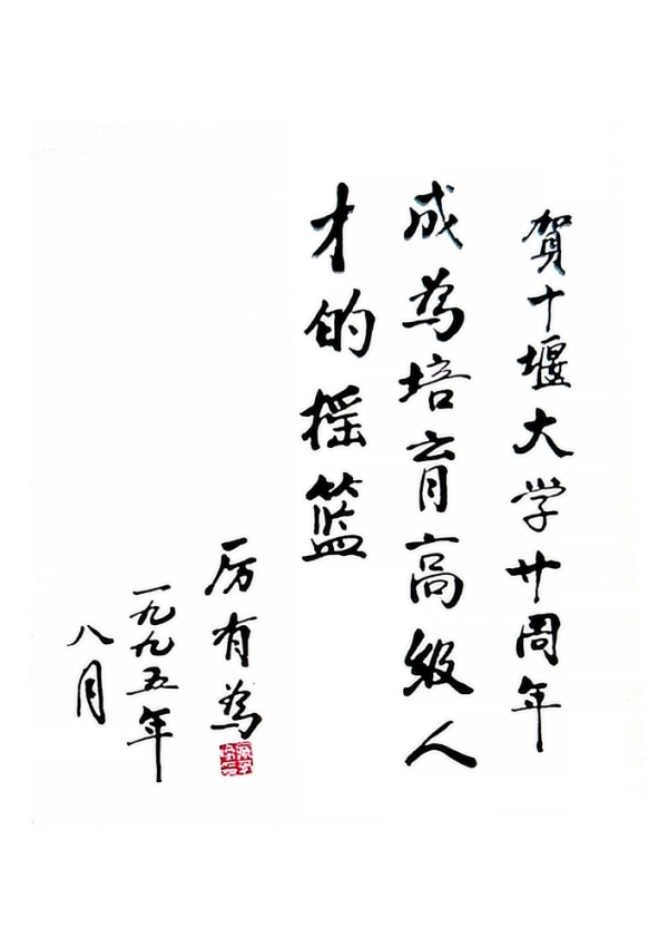 厉老一直关心着教育事业,特别是高等职业教育发展。1995年8月湖北工业职业技术学院20周年校庆前夕,厉老题词鼓励学校努力成为培育高级人才的摇篮。2018年5月,厉老来到十堰考察,向学校捐赠了《厉有为文集》《孺子牛》《悟牛斋诗词选及诗评》等图书。