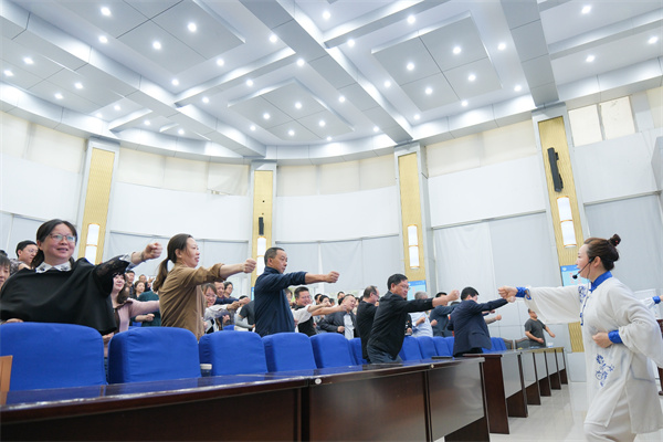 讲座在一段沉浸式“八段锦”健身功法体验中展开。讲座中,易天军首先向大家介绍了十堰市中医医院和精神卫生中心的基本情况、优势技术和诊疗特色,他结合近30年的临床诊疗经验,从心理健康的基本理念、情绪压力对身心工作的影响和处理、中医心理体系的形成、中医养生保健的原则和方法,以及中医辨证论治、整体观念的精髓,从专业角度进行了系统的诠释。他针对高校干部的工作特点,还传授和分享了自我调节、有效排解不良情绪、调整和谐人际关系、缓解焦虑压力等方面的技巧和心得。