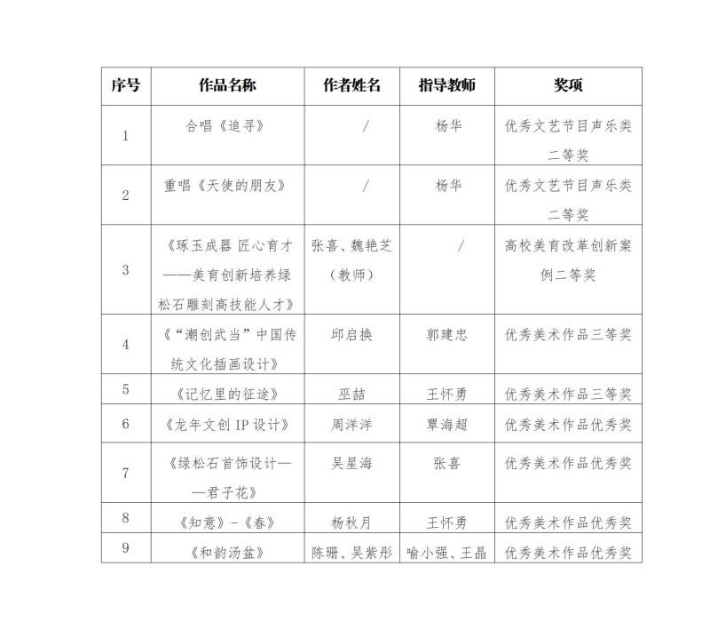新闻网讯(通讯员 高静)近日,湖北省第八届大学生艺术节系列活动评选结果公布,伟德官网师生在优秀文艺节目、优秀美术作品、优秀艺术实践工作坊、高校美育改革创新案例(“三优一案例”)评选中获奖9项,其中二等奖3项、三等奖2项、优秀奖4项。