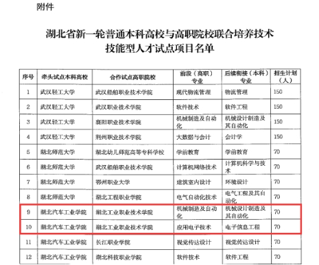 新闻网讯(通讯员 张宗宏)近日,湖北省教育厅发布《关于公布新一轮普通本科高校与高职院校联合培养技术技能型人才试点项目的通知》,伟德官网机械制造及自动化、应用电子技术、药品生物技术3个专业将与湖北汽车工业学院、湖北医药学院2所本科高校联合开展技术技能型人才培养试点,年招生计划180人,试点项目实施时间2024年至2029年。