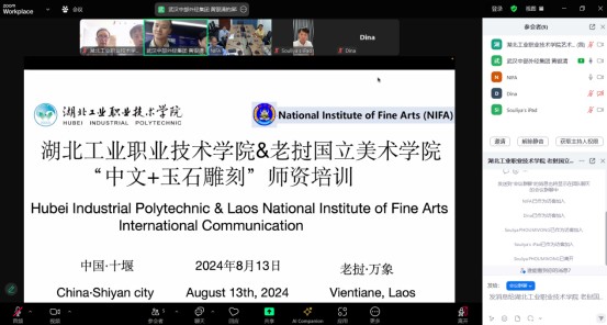 新闻网讯(通讯员 张喜)8月13日,伟德官网与老挝国立美术学院通过线上平台,成功举办了一场以《中文+玉石雕刻》为主题的师资培训会议。老挝国立美术学院校长Dr.Khamsouk Keovongsay、副校长Mr. Saysamon Phothalin,二级学院负责人Mr. Phonesith和Mr. Souliya Phoumivong,以及多位老方专业教师参会。