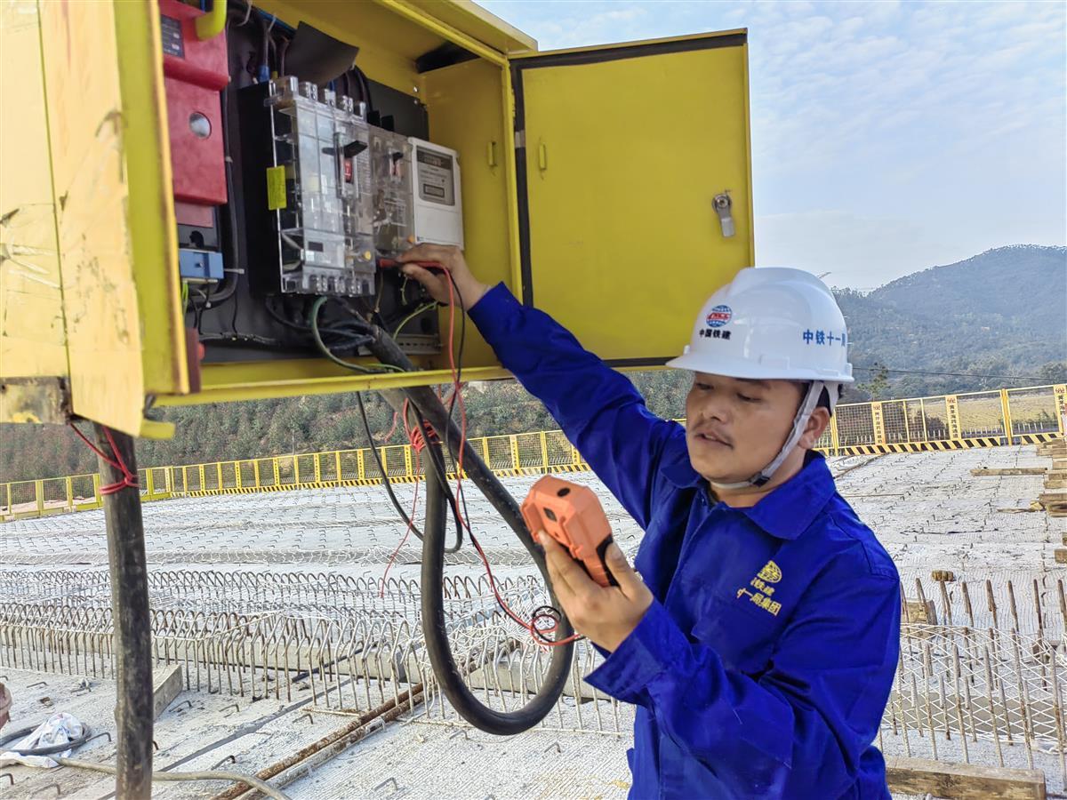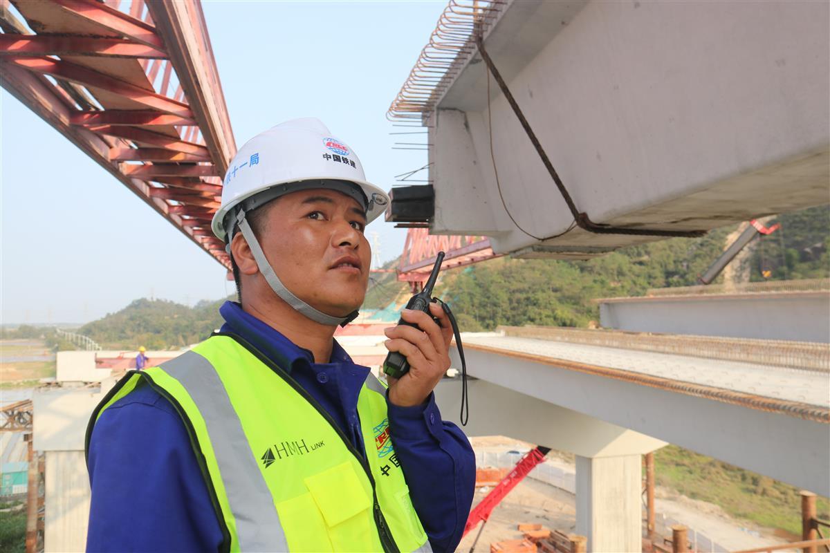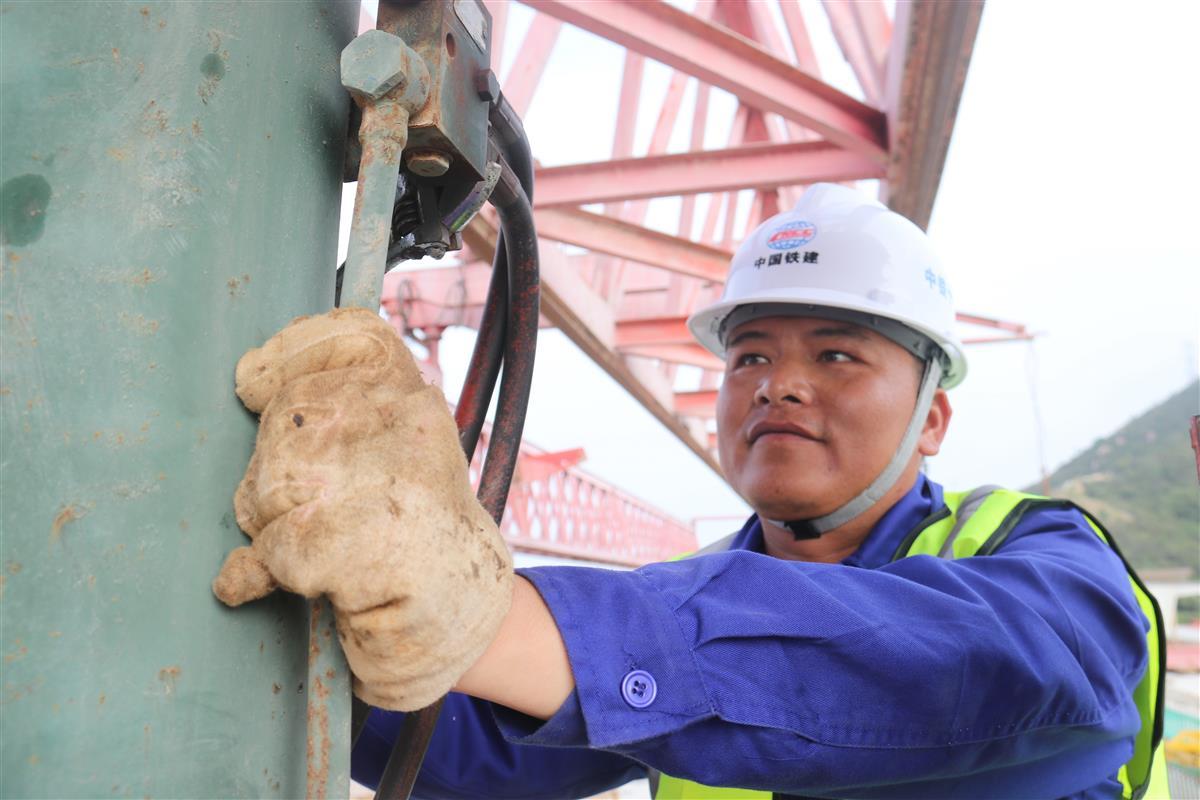 东方鱼肚渐白,工地上已经传来叮叮当当的敲击声,陈武林身穿蓝色工作服、头戴安全帽,站在架桥机上进行电路检修,认真巡查着每一处安全隐患,通过“NFC”扫描,对班前安全条件进行确认,为当天的架梁施工做准备,这是陈武林每天工作的日常。