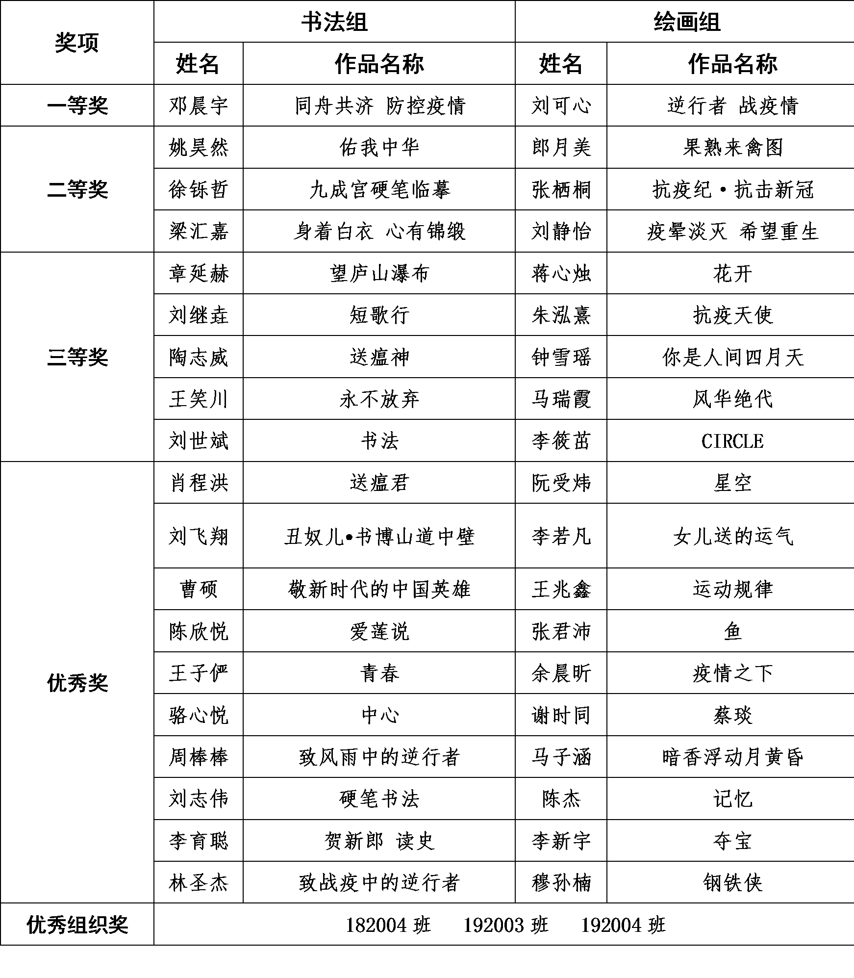 此次活动在4月30日正式开始,面向437437必赢国际网址全体本科生公开征集书法和绘画主题作品,得到了同学们的热烈响应,通知当晚便有同学提交了作品。在为期两周的创作时间内,智能学子们行文如流水,落笔如云烟,一幅幅构思精巧,创作精良的作品呈现出来。本次活动共计收到学生作品50余件,经过线上投票与评委线下打分,最终由邓晨宇创作的书法作品《同舟共济 防控疫情》摘得书法组一等奖,绘画组一等奖则由刘可心创作的《逆行者 战疫情》获得,182004等三个班级荣获“最佳组织奖”。