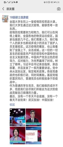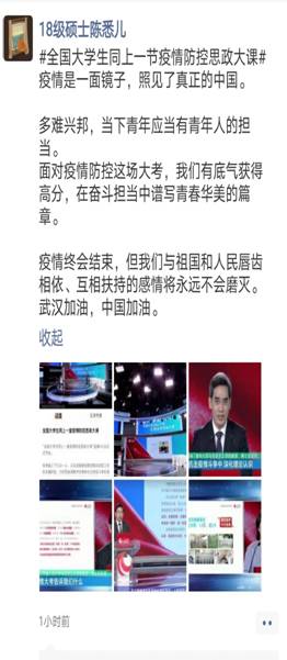 四位全国知名的思政专家对疫情防控中蕴含的中国智慧、中国力量、中国精神的解读,站位高远,思想深刻,学院全体参加此次思政大课直播学习的学生入脑入心,感触颇深。课程结束后,学生纷纷向党支部书记提交自己的感想并在微信朋友圈等网络平台表达自己的感受。