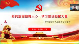 (通讯员 杨贵鹏)为深入学习贯彻党的十九届五中全会精神,12月22日下午,437437必赢国际网址硕士党支部在线上组织进行十九届五中全会精神宣讲活动,硕士191支部书记杨贵鹏和硕士202支部书记王璐围绕“宏伟蓝图鼓舞人心,学习宣讲凝聚力量”的主题进行了宣讲,全体党员及积极分子参加。