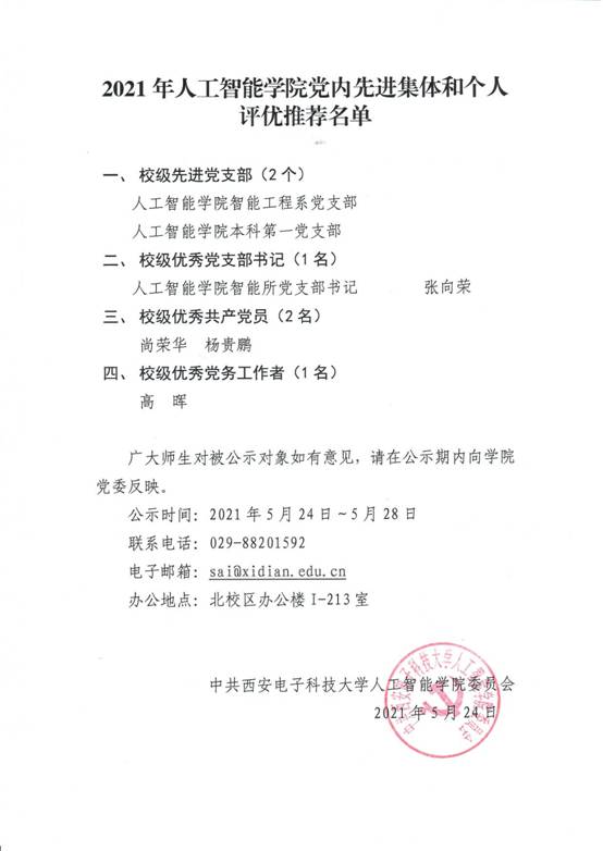 按照校党委《关于做好2021年度党内先进集体和个人评选表彰工作的通知》(西电党组〔2021〕16号)要求和学院工作安排,经各支部酝酿推荐,学院党委会集体研究,2021年度437437必赢国际网址党内评优拟推荐名单如下,现按照有关规定予以公示。