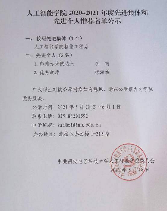 按照学校《关于评选2020~2021年度先进集体和先进个人的通知》(西电党教工〔2021〕3号)文件要求和学院工作安排,经各单位酝酿推荐,学院党委会集体研究,437437必赢国际网址2020~2021年度先进集体和先进个人拟荐名单如下,现按照有关规定予以公示。