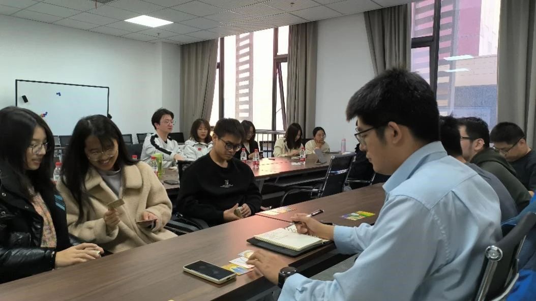 最后一个环节是利用欧卡牌进行自我解读和分享。在这个环节中,每位同学抽取了三张卡牌,分别代表着“开放我”、“盲目我”和“隐藏我”,对应着卡牌上的不同图案。尽管一开始同学们觉得卡牌上的图案很抽象,难以迅速与自我联系起来。刘老师却解释说,如果卡牌上的图案过于明确,可能会导致大家形成共识,从而难以与个体自我建立关联。随着刘老师的解释,同学们逐渐打开思维,成功分析出卡牌中“象征自我审视的镜子”以及“象征忙碌与焦虑的狭路”等元素。这一过程既引人发笑,又引发深刻的思考。通过卡牌游戏形式,该环节在轻松的氛围中让同学们表达了对学业压力等藏在心底的感受,增进了他们之间的沟通与理解。